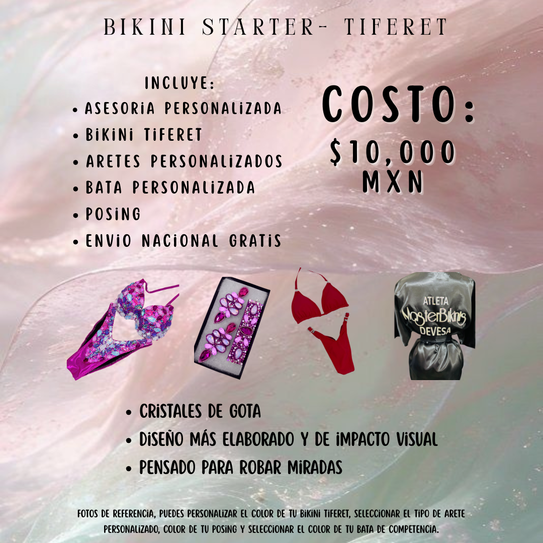 Incluye asesoría personalizada, Bikini Tiferet con cristales de gota, aretes personalizados, bata personalizada, posing suit y envío nacional gratis. Puedes personalizar el color de tu bikini, elegir el tipo de arete personalizado y seleccionar el color de tu bata y posing.